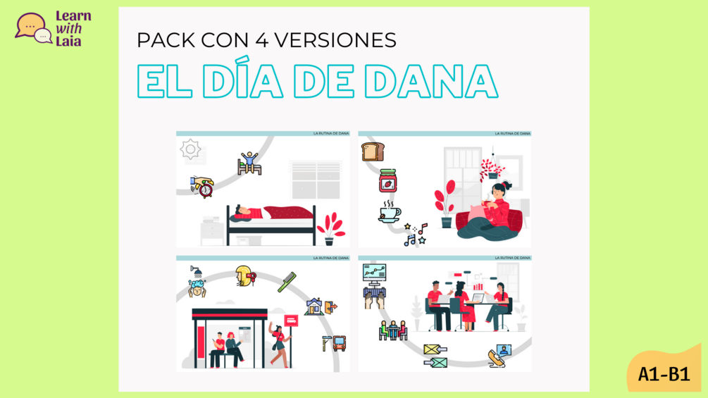 - B1. La rutina de Dana (sin vocabulario). Pretérito imperfecto, futuro. 8 páginas.